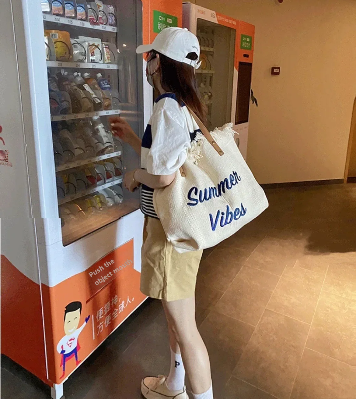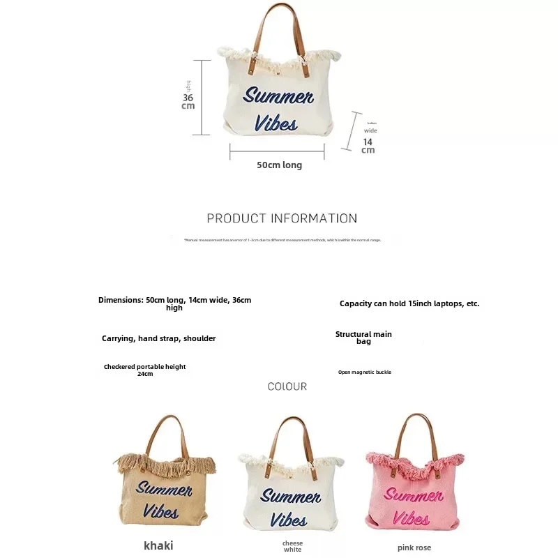 • تصميم عصري:تتميز حقيبة الشاطئ الجديدة بتصميم بسيط وعصري مع شرابات ، مما يجعلها خيارًا عصريًا لأي نزهة.