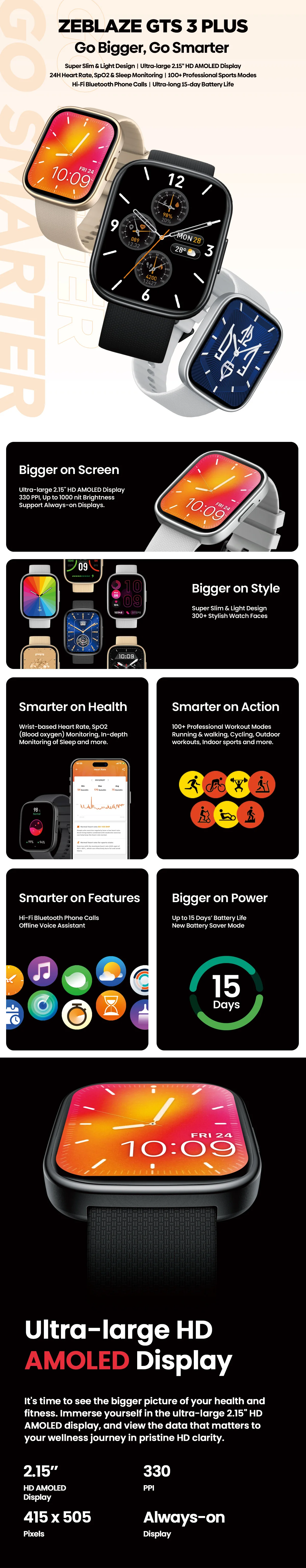 • شاشة AMOLED:يتميز Zeblaze GTS 3 Plus بشاشة AMOLED نابضة بالحياة ، تقدم صورًا واضحة وتجربة مشاهدة فائقة للمستخدمين.