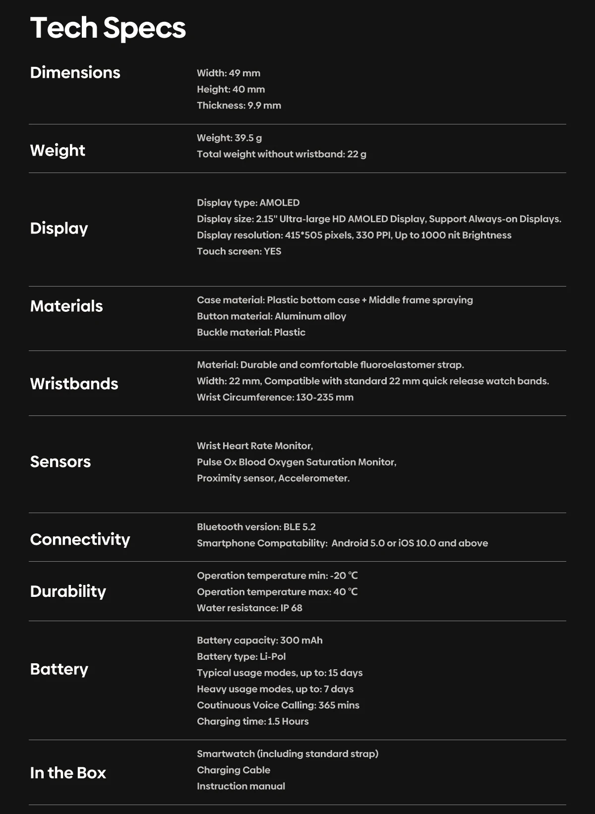 تحتوي هذه الساعة الذكية المدمجة للغاية على بطارية قوية للغاية ، مما يوفر 15 يومًا من التحمل على الاستخدام المعتاد وما يصل إلى 30 يومًا من عمر البطارية في وضع توفير البطارية.